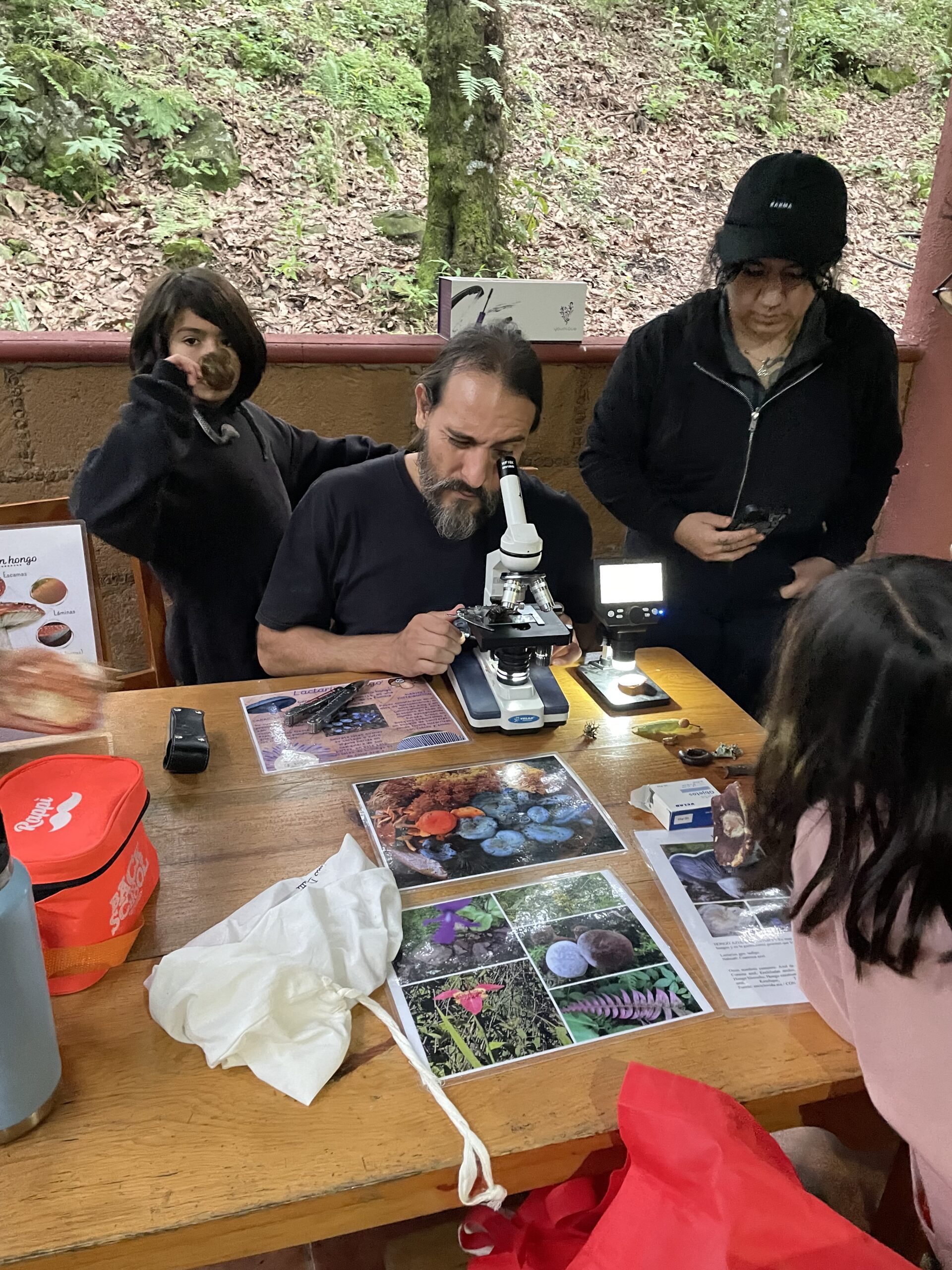 Durante la expedición se montó “el puesto de ciencia” donde las diferentes personas podían acercarse a curiosear, diseccionar y observar las diferentes partes de una seta u otras cosas que se encontraran en el bosque, todo fue devuelto al mismo, pues la idea es no generar un impacto ecológico en la zona 🙂