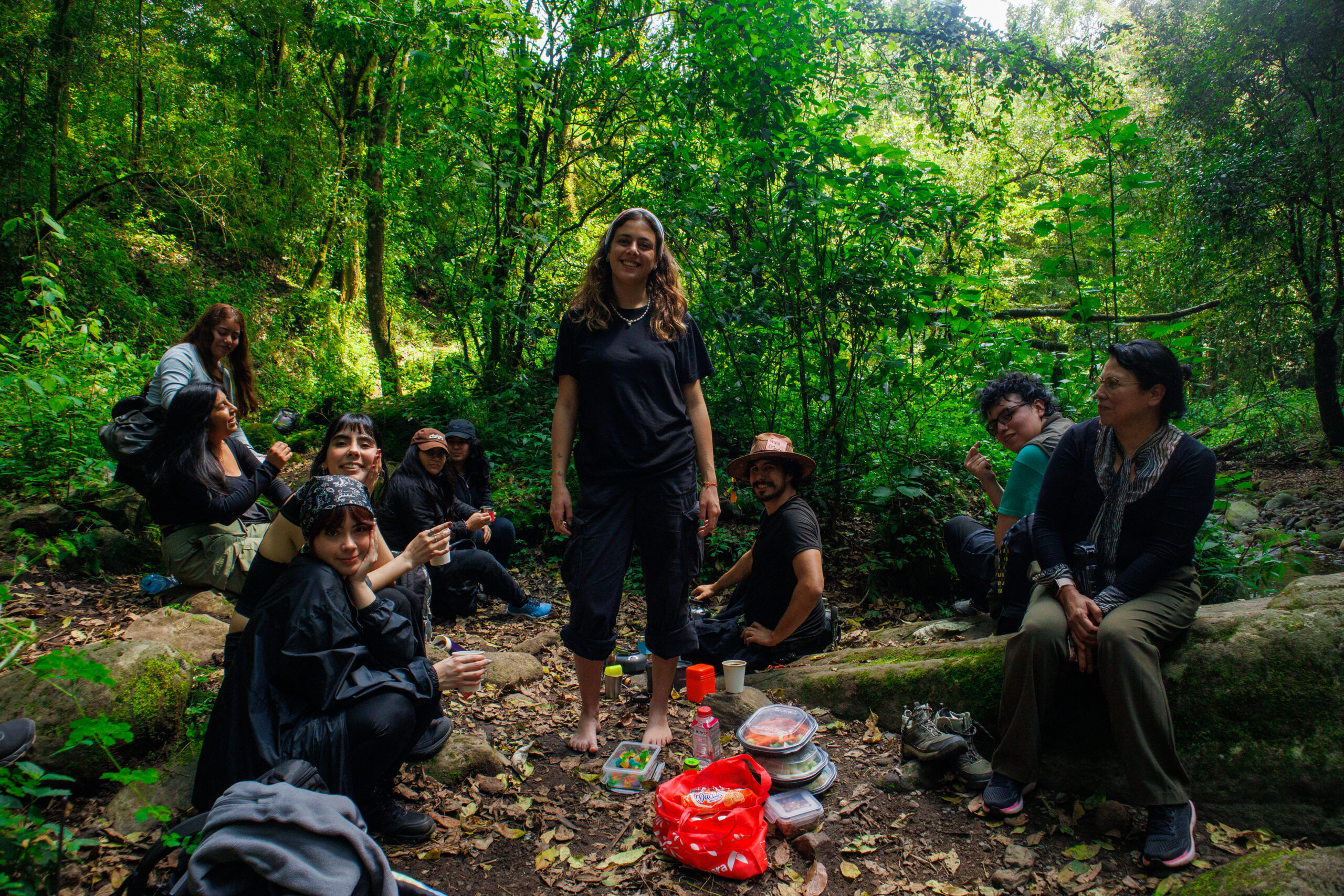 La caminata guiada fue el corazón de la expedición. Durante varias horas recorrimos senderos donde aparecieron hongos de colores, formas y texturas sorprendentes. Invitamos a cada participante a detenerse, observar y anotar sus hallazgos en libretas de campo o a tomar fotografías. La visita al río fue un descanso perfecto: ahí practicamos una breve meditación, escuchando el sonido del agua y reconociendo que el bosque también nos habla si sabemos guardar silencio.